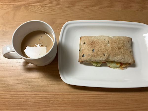 까페라떼 한 잔과 '베키아에누보'의 바질토마토치즈 치아바타 샌드위치를 함께 먹으면 집에서도 맛있는 브런치를 즐길 수 있습니다.